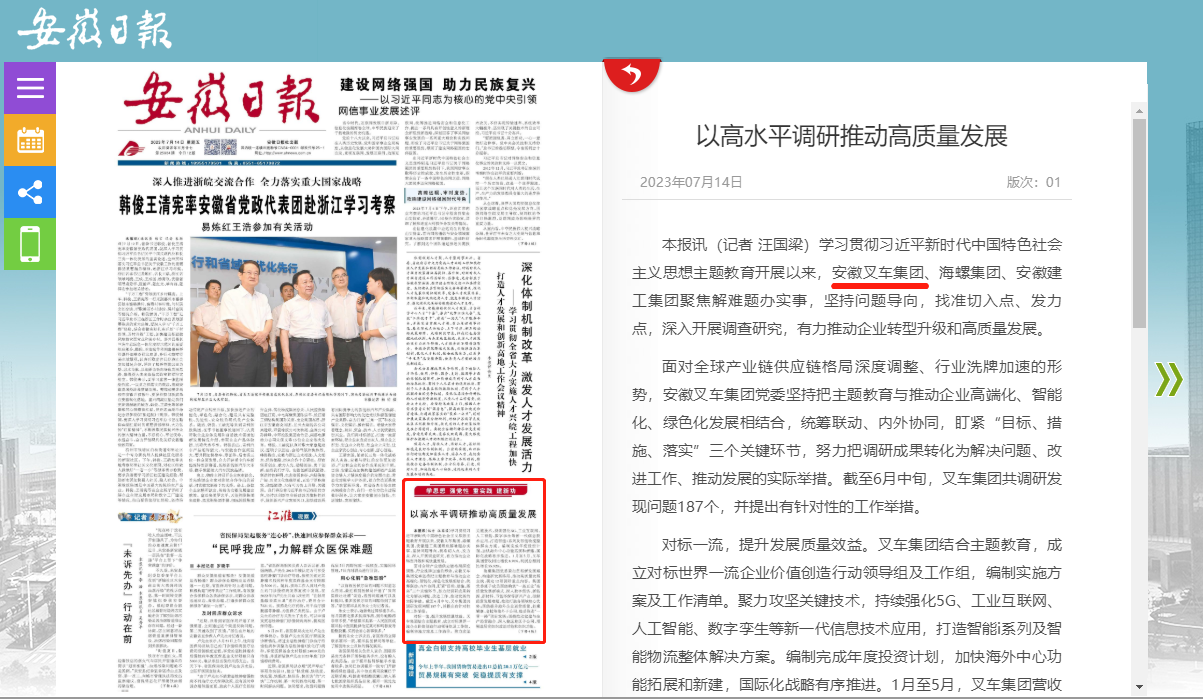 7月14日,《安徽日?qǐng)?bào)》在頭版中就安徽叉車集團(tuán)以高水平調(diào)研推動(dòng)高質(zhì)量發(fā)展情況進(jìn)行了報(bào)道。報(bào)道中表示,學(xué)習(xí)貫徹習(xí)近平新時(shí)代中國(guó)特色社會(huì)主義思想主題教育開展以來(lái),安徽叉車集團(tuán)聚焦解難題辦實(shí)事,堅(jiān)持問(wèn)題導(dǎo)向,找準(zhǔn)切入點(diǎn)、發(fā)力點(diǎn),深入開展調(diào)查研究,有力...